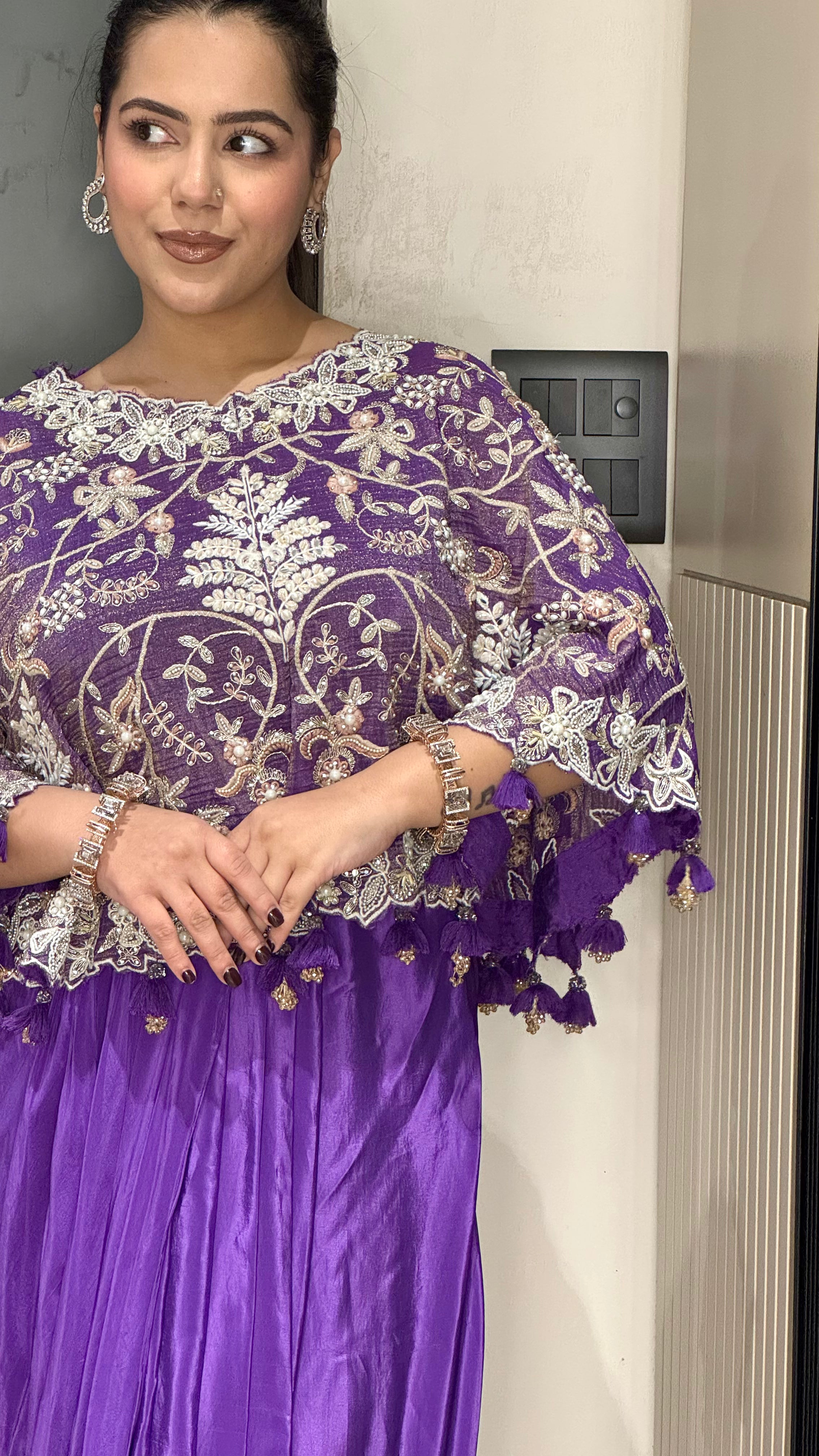 Make a statement this festive season with our elegant Indo-Western ensemble, crafted for modern celebrations. The outfit features a luxurious shimmer silk poncho adorned with intricate zari work, pearls, and sequin detailing, paired beautifully with comfortable crepe bottoms. Designed to blend tradition with contemporary flair, it’s perfect for festive gatherings, weddings, and special occasions.