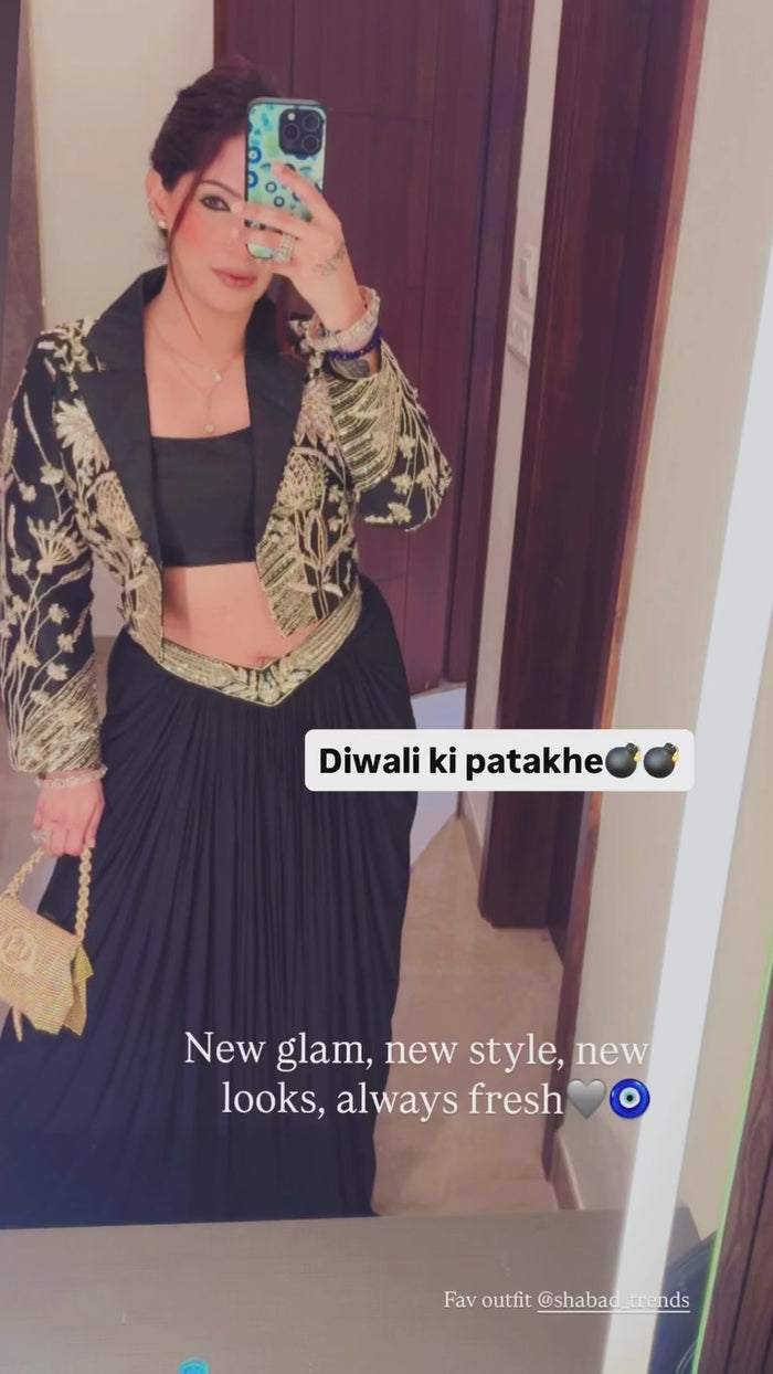Handwork Crop Top with Jacket & Draping Skirt Set – Elegant Festive Ensemble