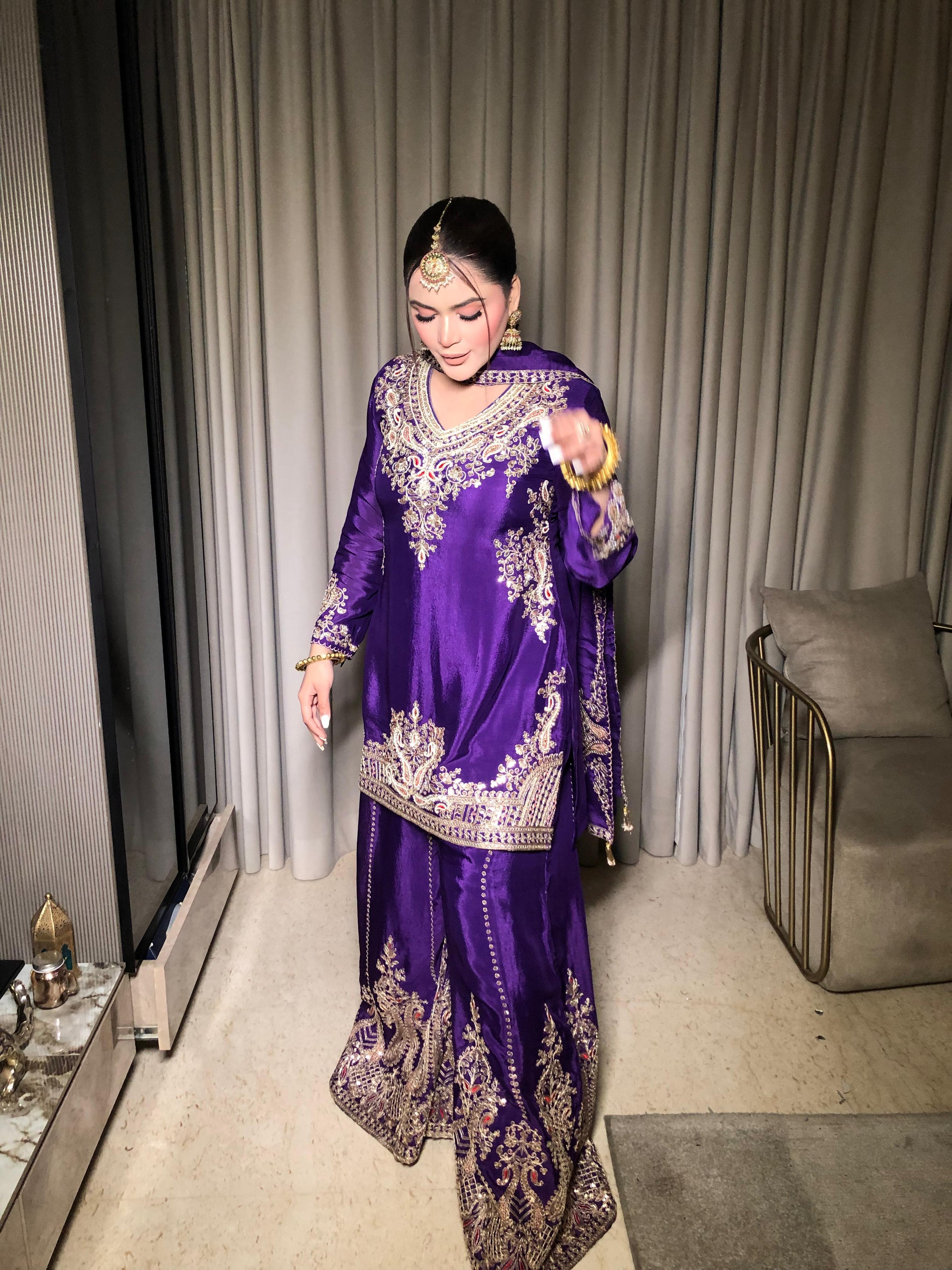 A stunning suit set crafted with premium sequence work and delicate pearl detailing, perfect for festive, party, and elegant evening looks.