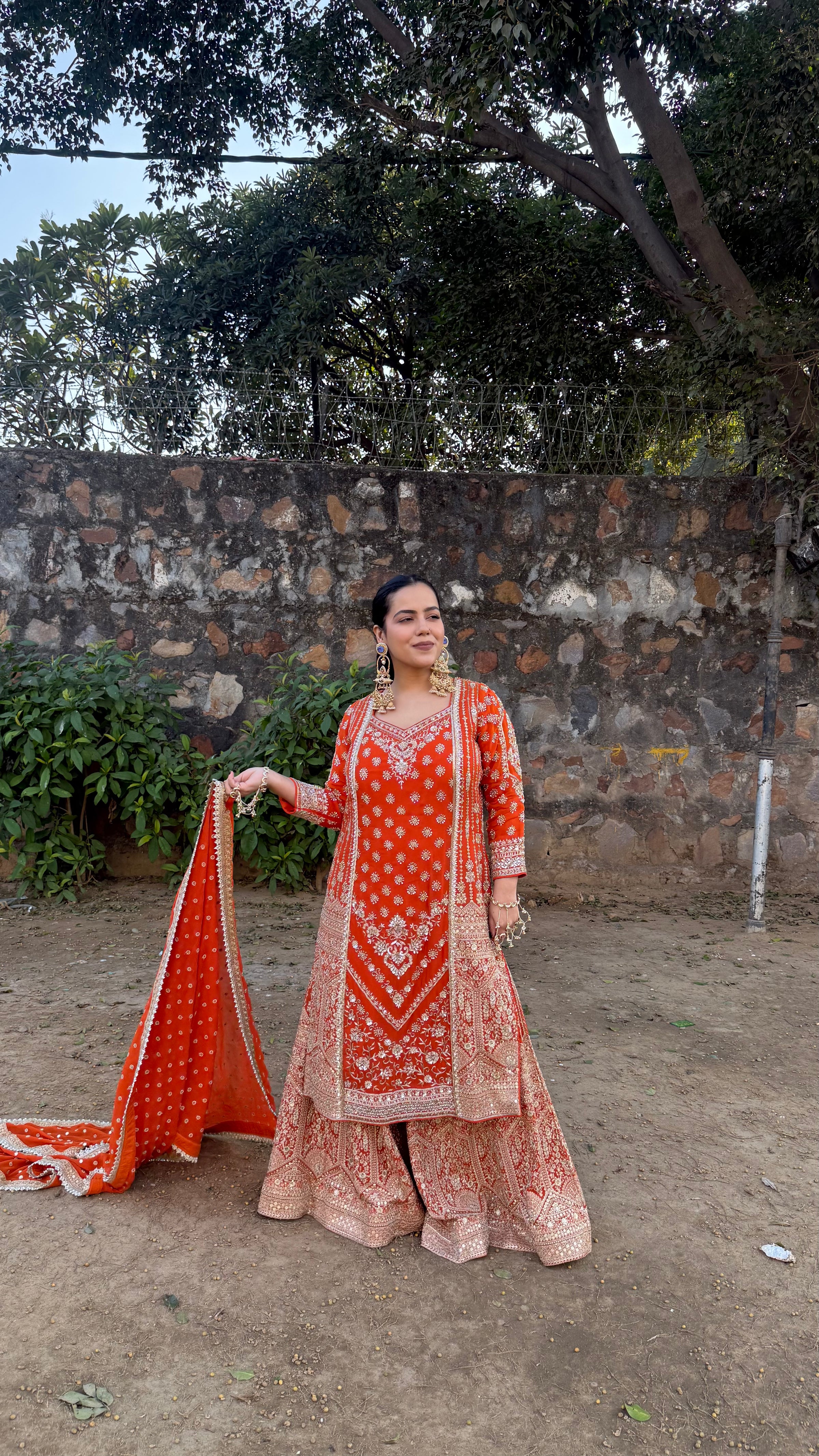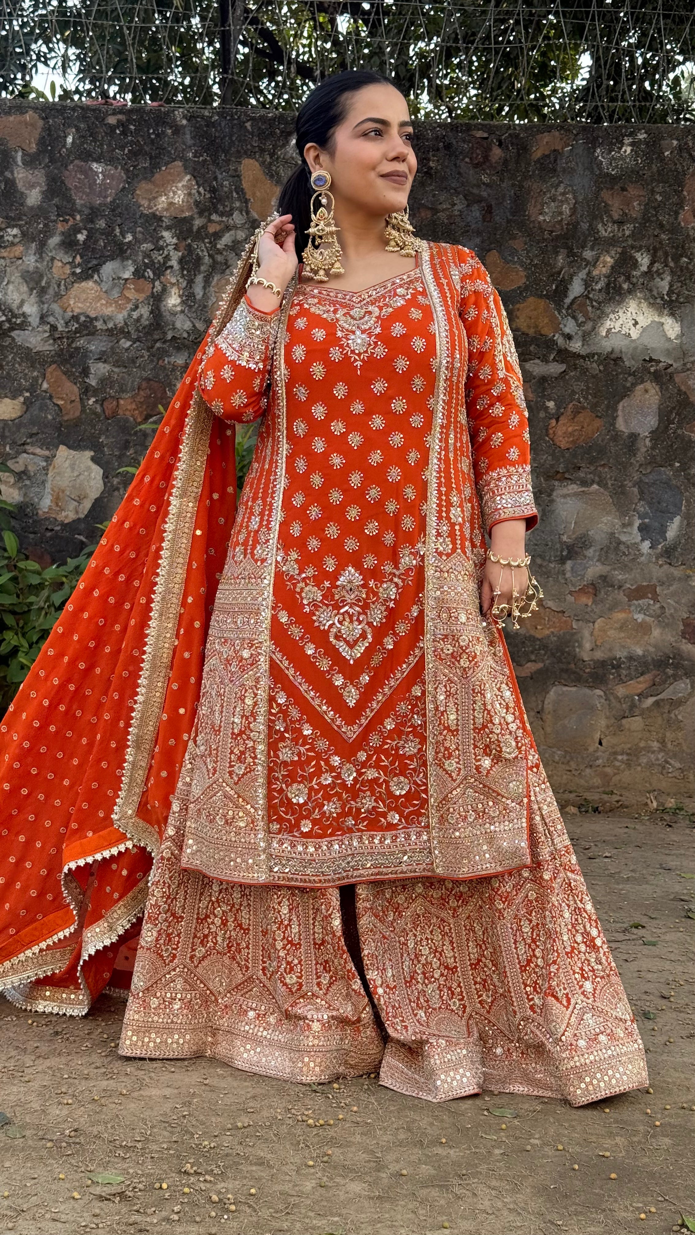 Step into timeless elegance with this beautifully crafted Georgette Suit Set, designed to make every occasion special. The outfit features intricate dabka, pearl, and sequin detailing that adds a luxurious festive charm, while the neem zari work bottom completes the look with a rich traditional finish.